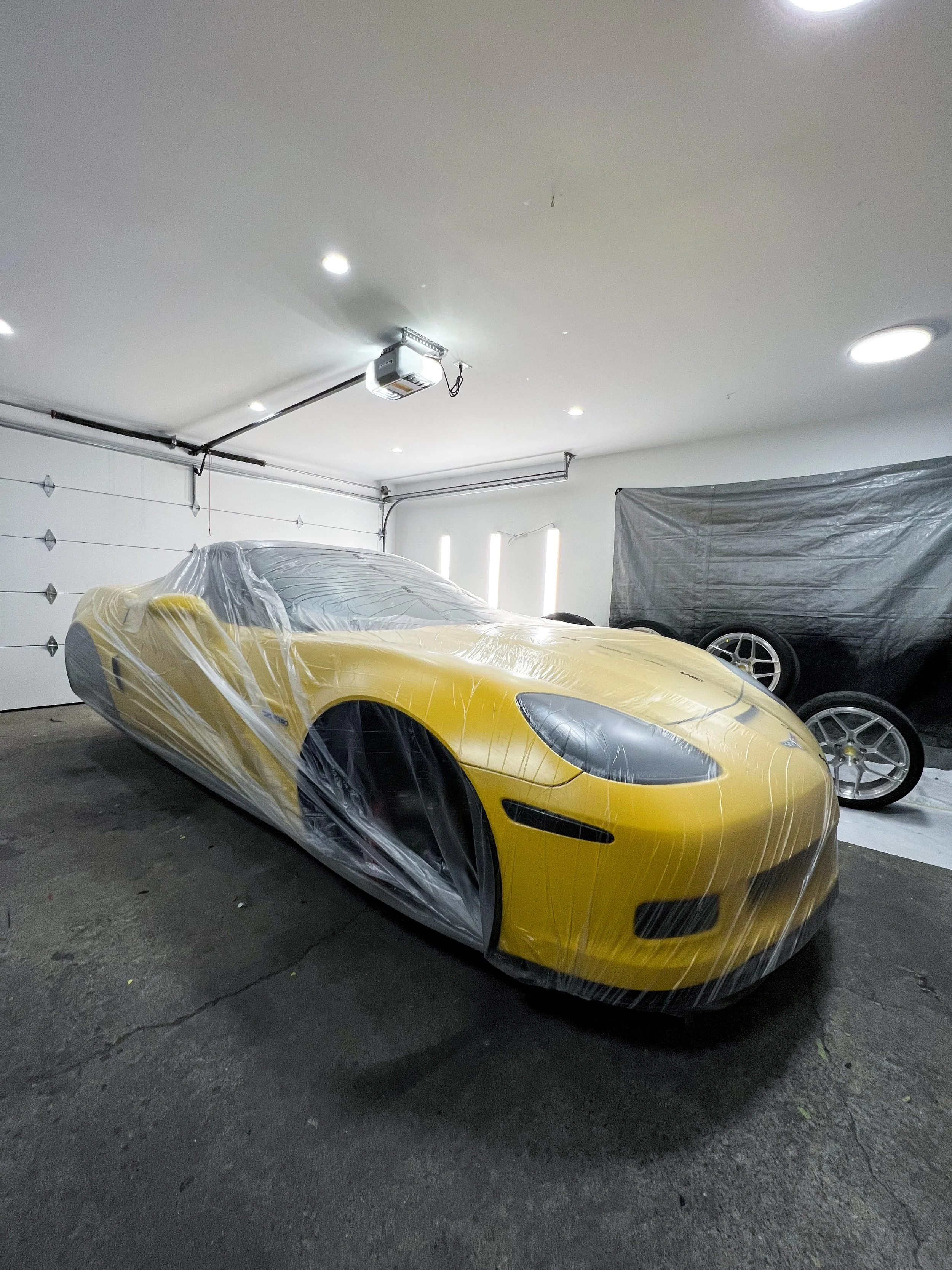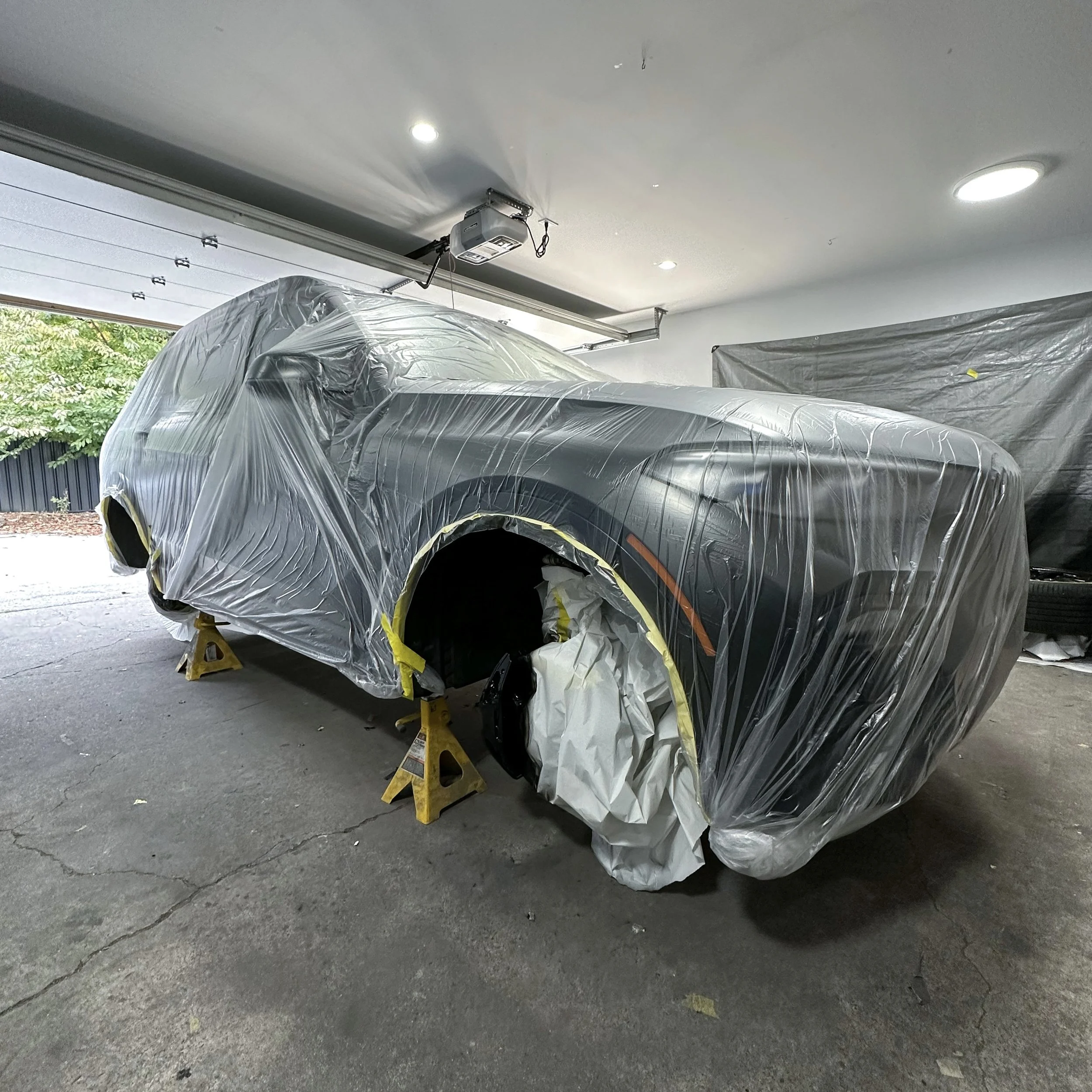 The entire vehicle is covered in plastic sheeting and all areas surrounding the brake calipers are masked off to protect the vehicle from any overspray.